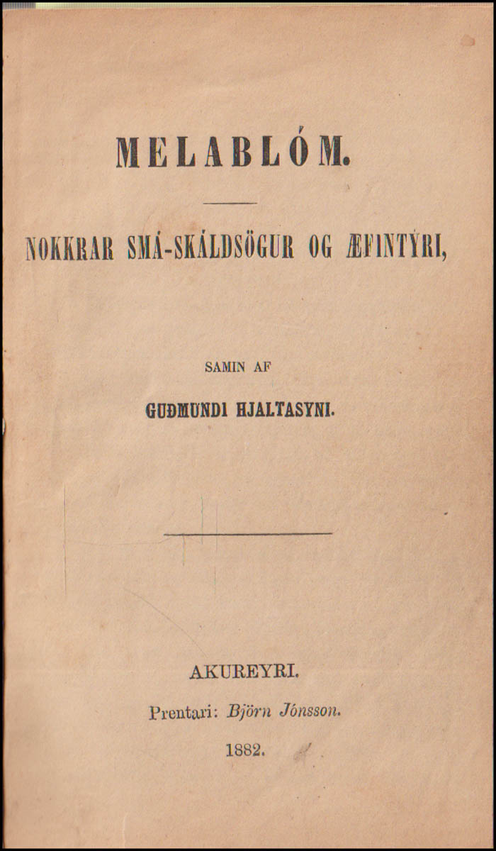 Melablóm. Nokkrar Smá-skáldsögur og æfintýri. Samin af Guðmundi Hjaltasyni. - Akureyri. Prentari Björn Jónsson, 1882. - Skáldsögur. cm
