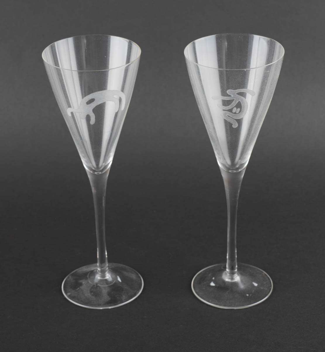 2 kampavínsglös með sandblásnum skreytingum - Gler - Ómerkt. 25 x 9 cm