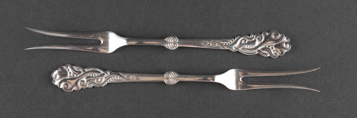 Tveir áleggsgafflar - Silfur - 42 g. Danskt. Merkt. 16 cm
