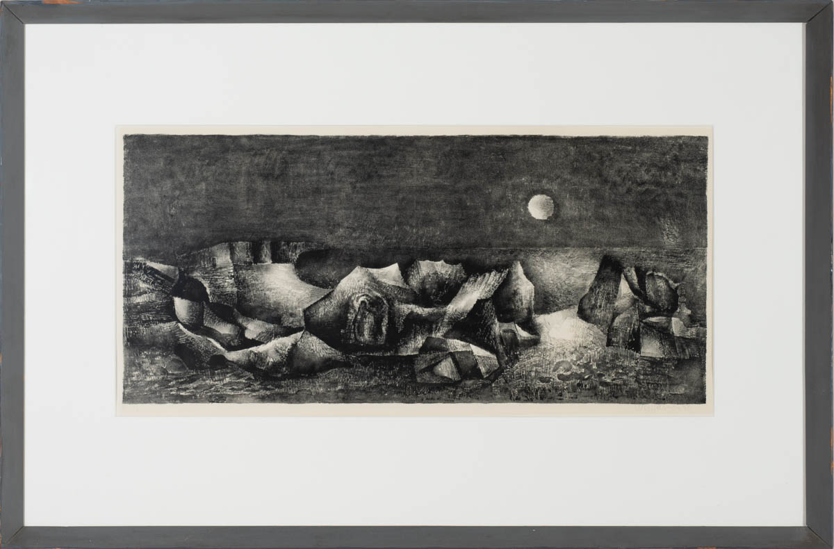 Tunglskin á Öræfum - Þrykk - 1958. Merkt. E/A. 29 x 62 cm
