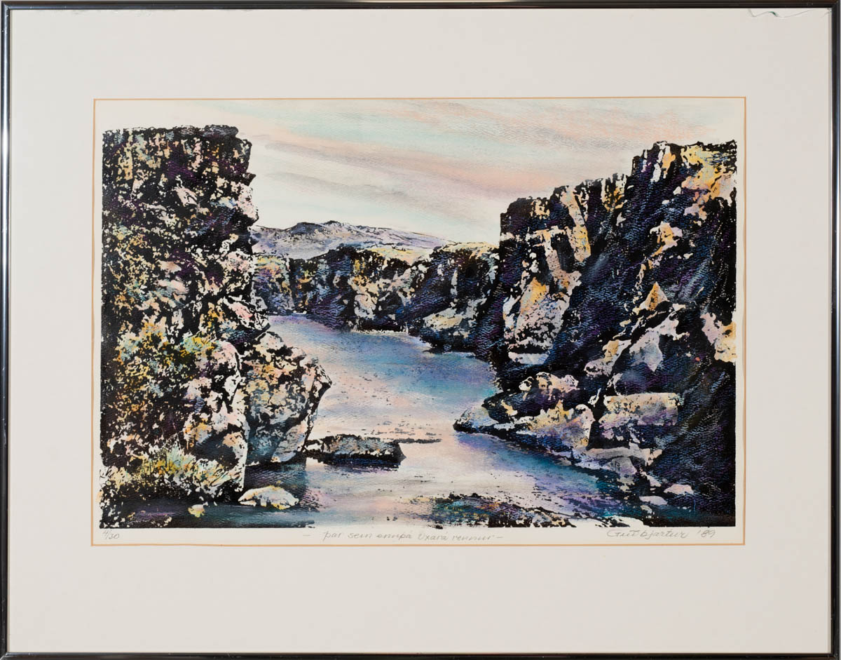 Þar sem ennþá Öxará rennur - Þrykk. Brot í gleri - 1989. Merkt. 4/30. 30 x 46 cm