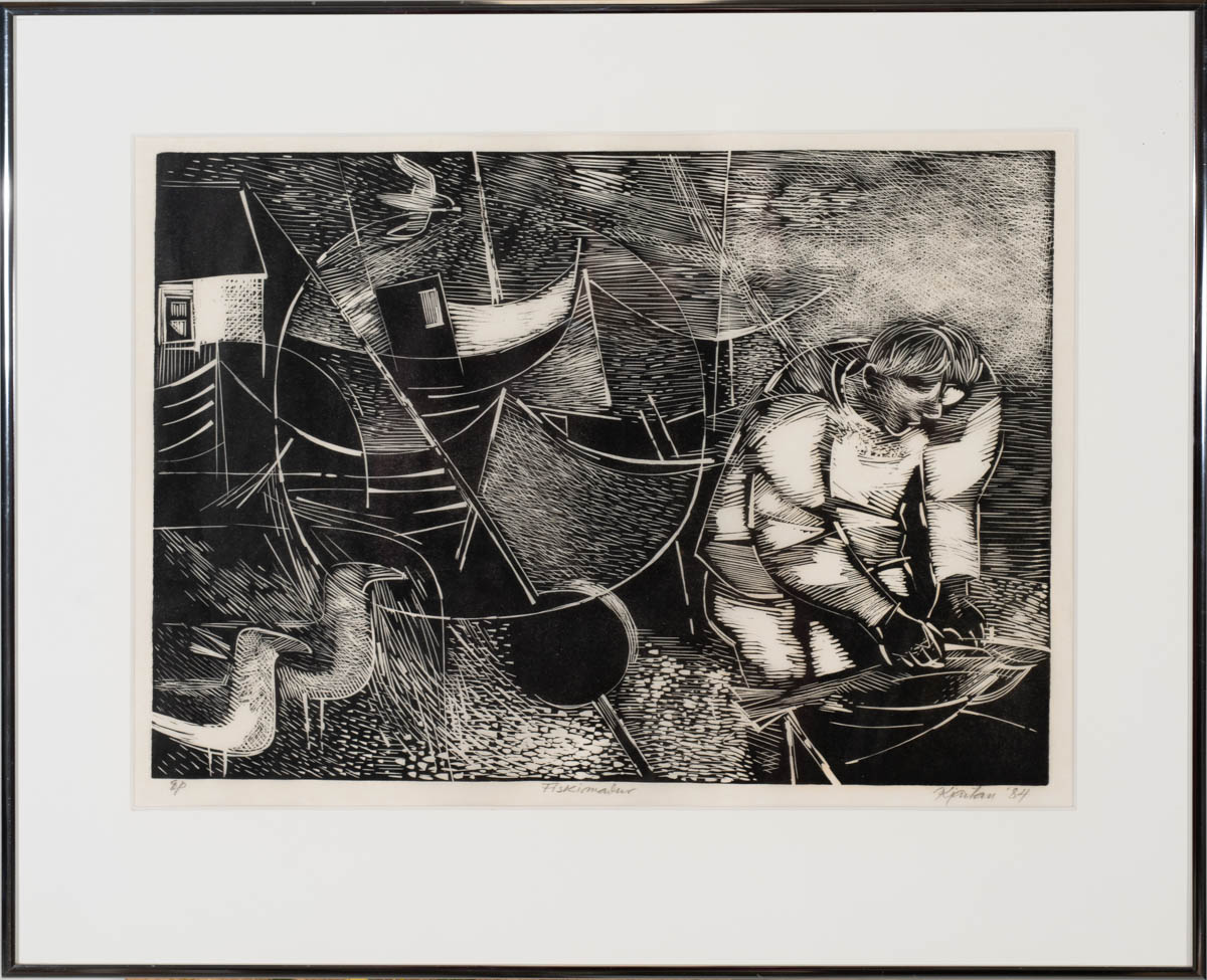 Fiskimaður - Þrykk - 1984. Merkt. E/þ. 32 x 42 cm