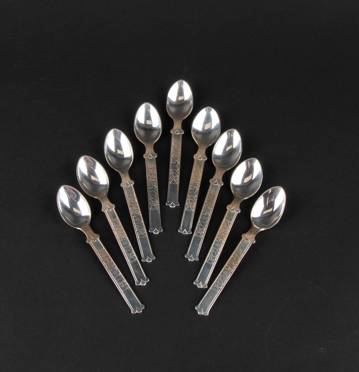 Níu mokkaskeiðar - Höfðaletur - Silfur - 925s. 141 g. Merkt. 12 cm