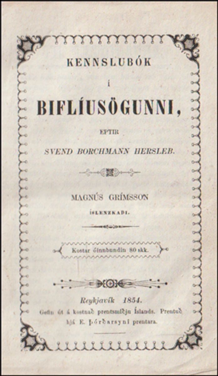 Kennslubók í biflíusögunni eftir Svend Borchmann Hersleb. Magnús Grímsson íslenzkaði. - Kristur og kirkja. - Reykjavík. Prentsmiðja Íslands, 1854. cm