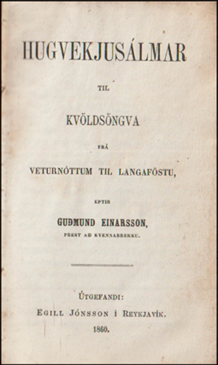 Hugvekjusálmar til kvöldsöngva frá veturnóttum til langaföstu. Eptir Guðmund Einarsson prest að Kvennabrekku. - Helgikvæði. Sálmar. - Reykjavík. Egill Jónsson, 1860. cm
