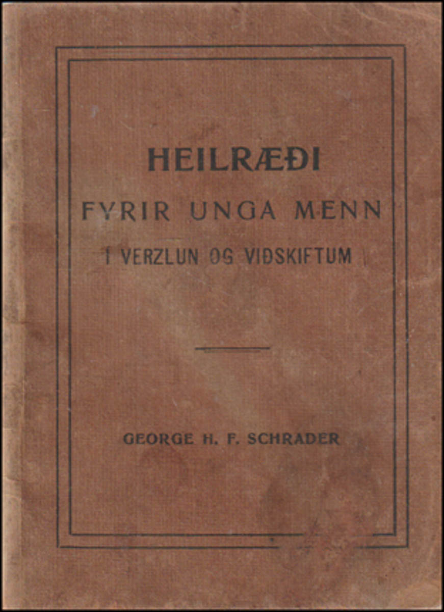 Heilræði fyrir unga menn í verzlun og viðskiftum eftir George H.F. Schrader. Þýtt hefur Steingrímur Matthíasson. George H. F. Schrader var þýskættaður maður sem eyddi hér síðustu þremur árum ævi sinnar áður en hann fyrirfór sér árið 1915, aðeins 57 ára gamall. Schrader bjó á Akureyri og sinnti margvíslegu menningar- og uppbyggingarstarfi. - Verslun og viðskipti. - Akureyri, 1913. cm