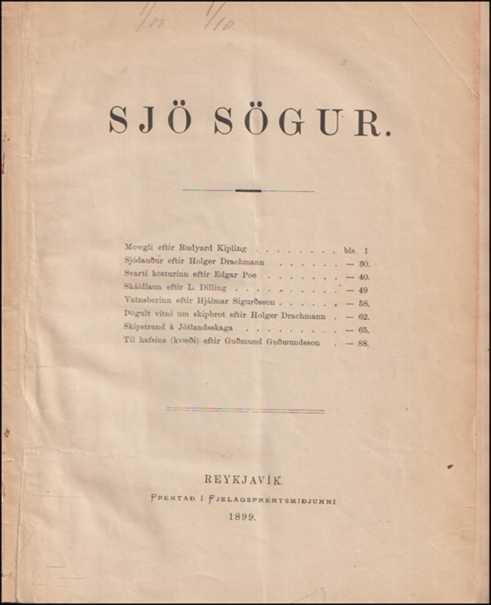 Sjö sögur. Hér eru eftirtaldar sögur - Mowgli. Eftir Rudyard Kipling. - Sjódauður - Þögult vitni um skipbrot. Eftir Holger Drachmann. - Svarti kötturinn. Eftir Edgar Allan Poe. - Skáldalaun. Eftir L. Dilling. - Vatnsberinn. Eftir Hjálmar Sigurðsson. - Skipstrand á Jótlandsskaga. - Til hafsins. Kvæði eftir Guðmund Guðmundsson skólaskáld. - Smásögur. - Reykjavík. Prentað í Fjallkonuprentsmiðjunni, 1899. cm