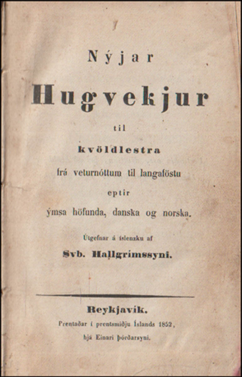 Nýjar hugvekjur til kvöldlestra frá veturnóttum til langaföstu eptir ýmsa höfunda, danska og norska. Útgefnir á íslenzku af Svb. Hallgrímssyni. - Kristur og kirkja. - Reykjavík. Prentaðar í prentsmiðju Íslands hjá Einar Þórðarson, 1852. cm