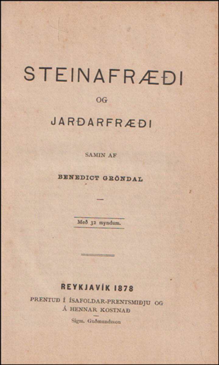 Steinafræði og jarðarfræði samin af Benedict Gröndal. Með 32 myndum. - Kennslubækur. - Reykjavík. Prentuð í Ísafoldar-prentsmiðju og á hennar kostnað, 1878. cm