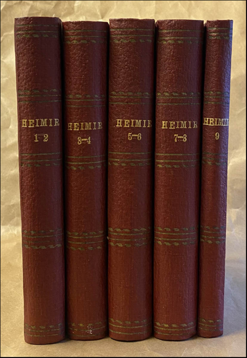 Heimir. Tímarit. 1. til 9. árgangur. Allt sem út kom. Ritstjóri Rögnvaldur Pétursson. Útgefendur voru Nokkrir Íslendingar í Vesturheimi. Hér eru greinar um ýmis Vesturheimsmálefni, sögur og ljóð, og að sjálfsögðu er eitthvað um trúmál. Hér er Heimir allur í ágætu bandi. - Tímarit. - Winnipeg. Nokkrir Íslendingar í Vesturheimi. Hið íslenzka únítaríska kirkjufélag í Vesturheimi, 1904-1914. cm
