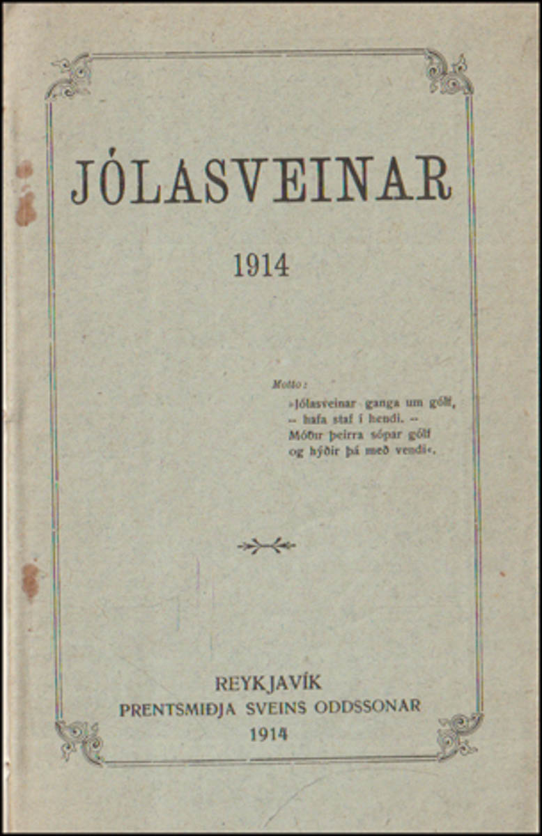 Jólasveinar 1914. Þetta er lúmskur skratt. Þykist vera jólablað en er í raun háðsádeila um stjórnmál og stjórnmálamenn. Ljóð, stökur og leikþættir. En svo eru auglýsingar um ýmsar jólavörur. - Tímarit. - Reykjavík. 1914. cm