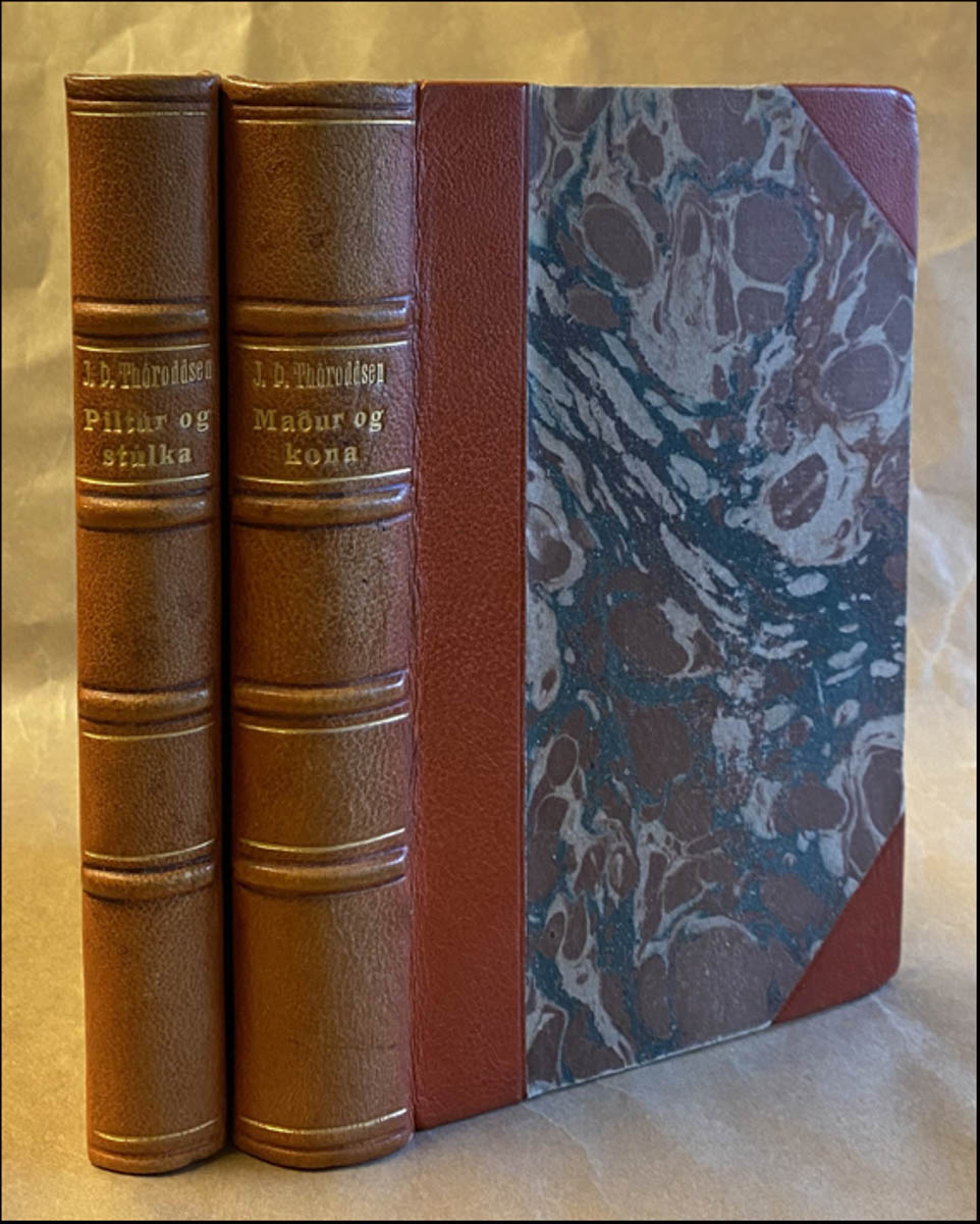 Hér eru í fallegu, skreyttu skinnbandi þessar tvær bækur. - Piltur og stúlka. Dálítil frásaga eftir Jón Thoroddsen. Fjórða prentun. Reykjavík. Sigurður Kristjánsson, 1923. - Maður og kona. Skáldsaga eftir Jón Thoroddsen. Þriðja prentun. Reykjavík. Sigurður Kristjánsson, 1923. - Skáldsögur.