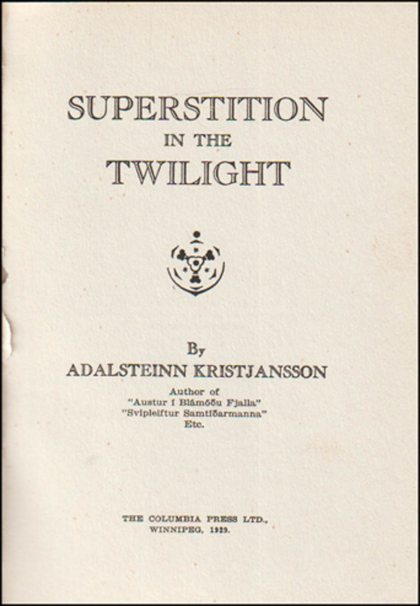 Superstition in the Twilight. By Adalsteinn Kristjansson. Author of Austur í Blámóðu Fjalla - Svipleiftur samtíðarmanna - Etc. Gott eintak, áritað í bundunu máli til Sveins Björnssonar forseta og prýðir bókmerki hans bókina. - Þjóðlegur fróðleikur. - Winnipeg. Columbia Press, 1929. cm