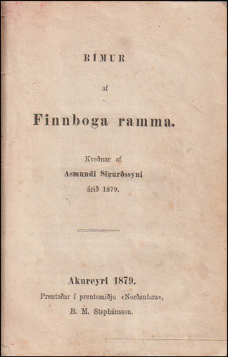 Saman í gömlu bandi eru þessar bækur. - Rímur af Finnboga ramma. Kveðnar af Ásmundi Sigurðssyni árið 1879. Akureyri 1879. Prentaðar í prentsmiðju Norðanfara. B. M. Stephánsson. - Rímur af Geirarði og Elinborgu, kveðnar á Suðurlandi árið 1871 af Símoni Bjarnasyni Dalaskáldi. Útgefandi Stefán Sveinsson. Akureyri. Prentari Björn Jónsson. 1884. - Sneglu-Halli. Ýmisleg ljóðmæli eptir Símon Bjarnarson Dalaskáld. Akureyri. Prentað hjá Birni Jónssyni 1883. - Rímur.