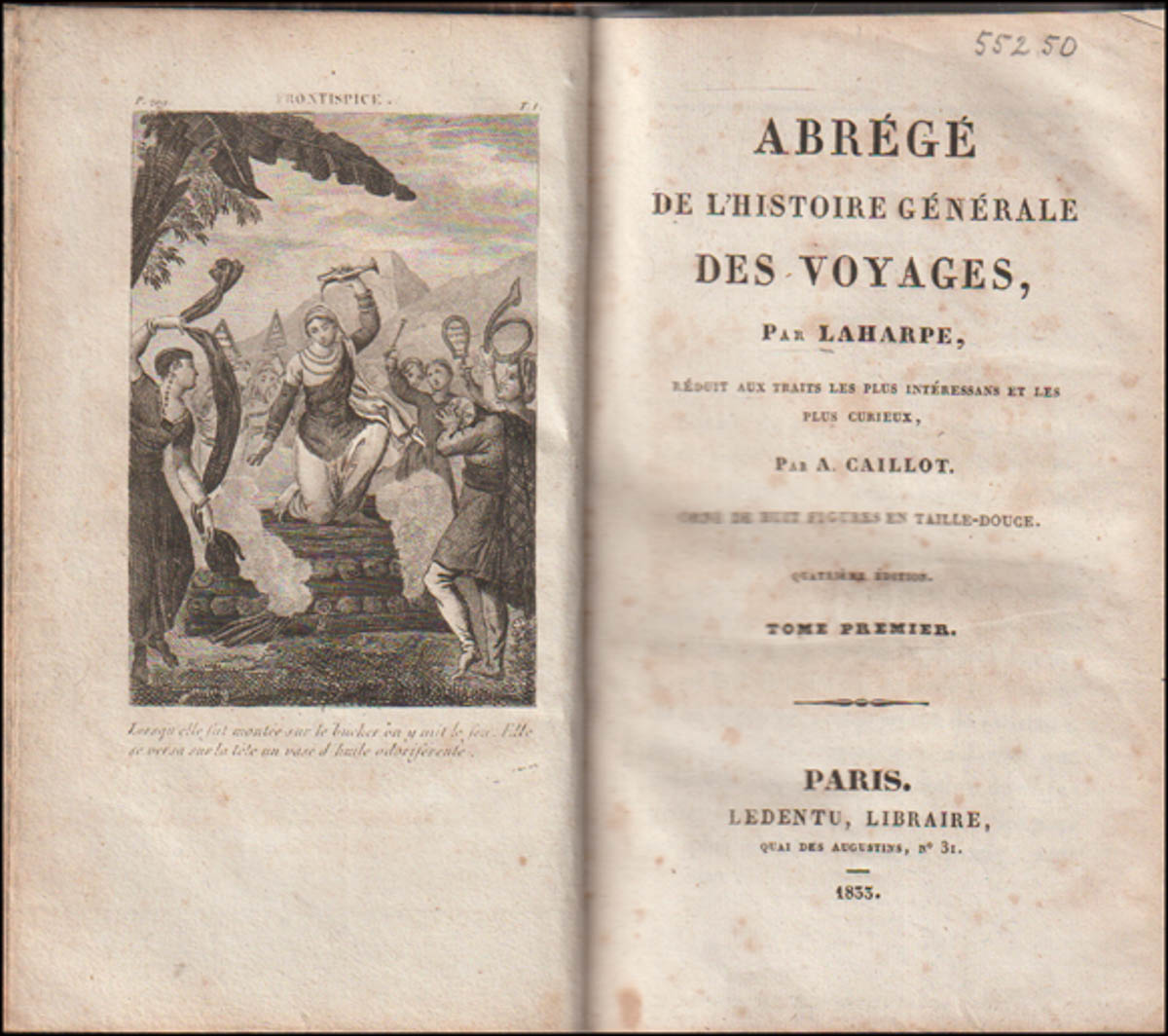 Abrege' de l'histoire generale des voyages, par La Harpe, reduit aux traits les plus interessans et les plus curieux, par A. Caillot. Orné de huit figures en taille-douce. Quatriéme édition. Tome Premier. - Ferðabækur. - Paris. Ledentu, Libraire, 1833. cm