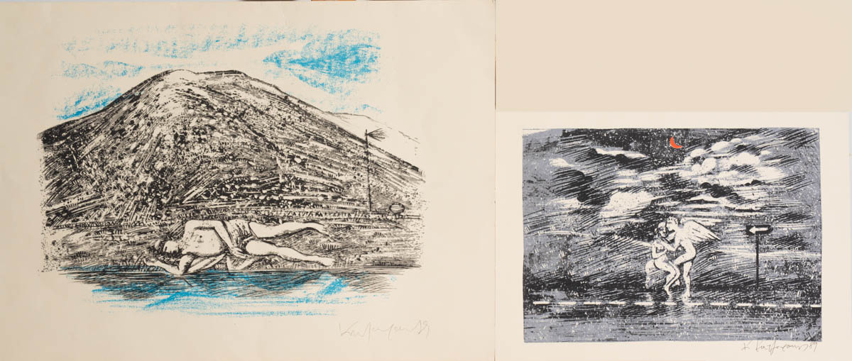 Tvö þrykk - Þrykk - 1989. Minni 24x30. Merkt. 34 x 40 cm