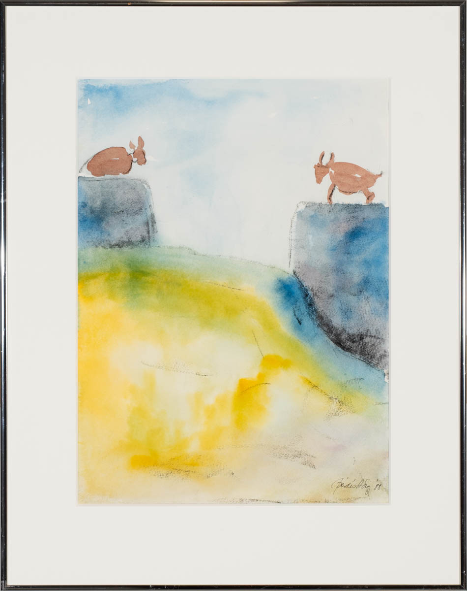 Þegar allt er kyrrt I / Geitur tvær - Vatnslitir - 1988. Merkt. 45 x 33 cm