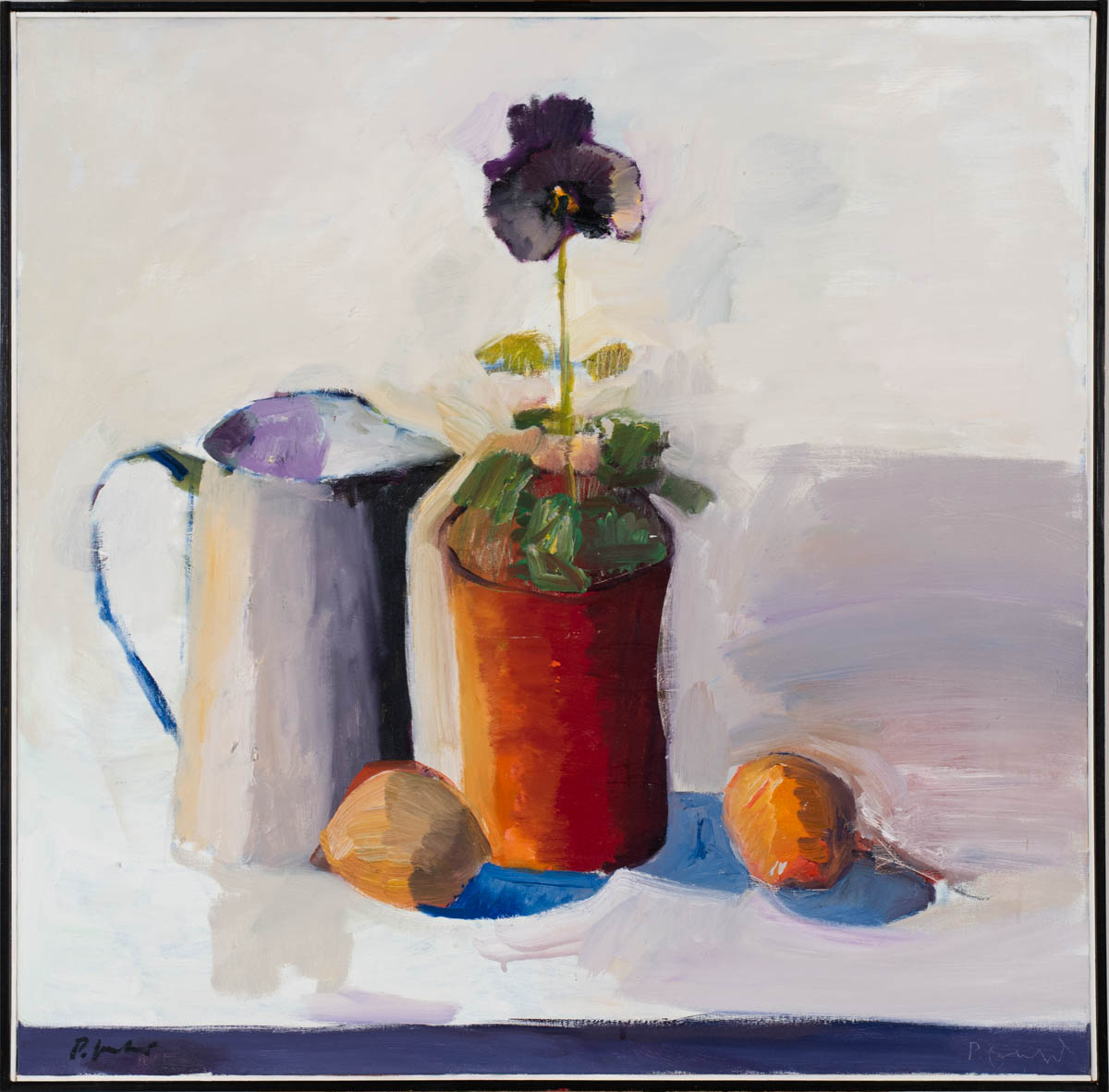 Uppstilling með könnu og blómi - Olía - 2010. Merkt. 80 x 80 cm