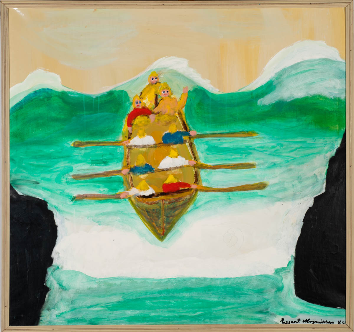 Sexæringur rær í átt að landi - Olía - 1985. Merkt. 90 x 95 cm