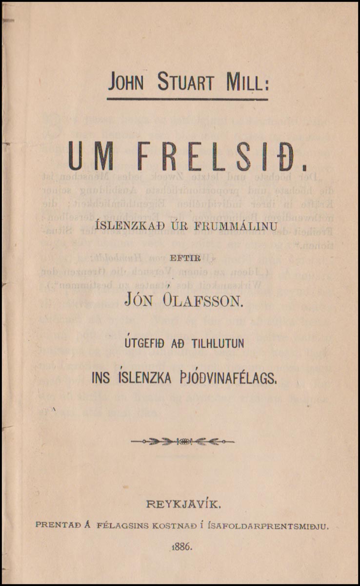 Um frelsið eftir John Stuart Mill. Íslenzkað úr frummálinu eftir Jón Ólafsson. Fyrsta útgáfa Frelsisins á íslenzku. - Stjórnmál. - Reykjavík. Hið íslenzka þjóðvinafélag, 1886. cm