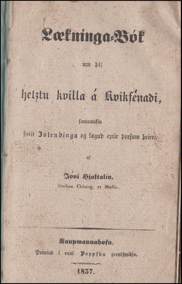 Lækninga-Bók um þá helztu kvilla á Kvikfénadi, samantekin fyrir Islendinga og løgud eptir þørfum þeirra af Jóni Hjaltalín, Studios. Chirug. et Medic. - Læknisfræði. - Kaupmannahöfn. Prentuð í enni Poppsku prentsmiðju, 1837. cm