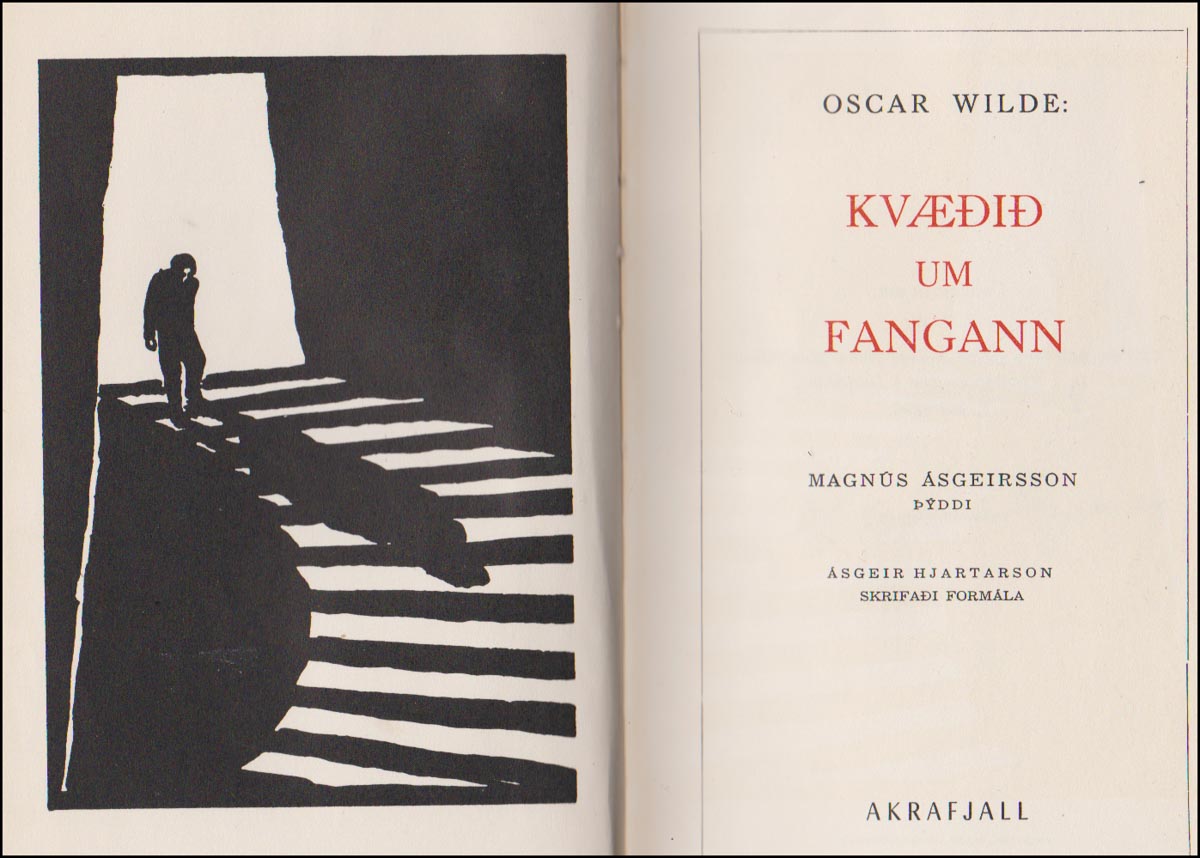 Kvæðið um fangann. Ljóð eftir Oscar Wilde. Magnús Ásgeirsson þýddi. Ásgeir Hjartarson skrifaði formála. Gefið út í 350 tölusettum eintökum. Þetta eintak er nr. 312. Áritað af Magnúsi Ásgeirssyni. - Ljóðabók. - Reykjavík. Akrafjall, 1954. cm