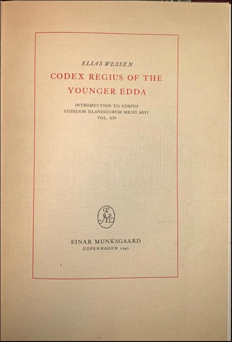 Codex Regius of the Younger Edda. Introduction to Corpus codicum Islandicorum medii aevi, vol. XIV. Elias Wessén. Þessi bók er inngangur Elíasar Wésséns prófessors að Konungsbók Snorra Eddu sérprentaður. Bókin er prentuð í 125 eintökum til handa vinum ein - Íslensk- og norræn fræði. - Copenhagen. Einar Munksgaard, 1940. cm