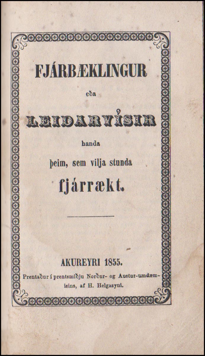 Fjárbæklingur eða leiðarvísir handa þeim, sem vilja stunda fjárrækt. Höfundar Hálfdán Jóakimsson, Helgi Jónsson og Jón Ingjaldsson. Fjárbæklingur þessi er árangur af vinnu nefndar sem bændur í Ljósavatnshreppi settu á laggirnar. - Bændur og búalið. - Akureyri 1855. Prentaður í prentsmiðju norður- og austurumdæmisins, hjá Helga Helgasyni. cm