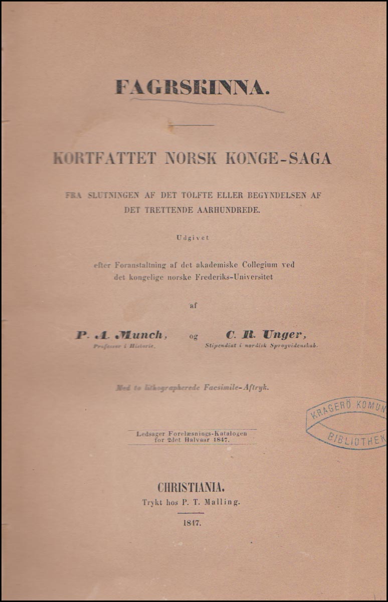 Fagrskinna. Kortfattet norsk Konge-Saga fra Slutningen af det tolfte eller Begyndelsen af det trettende Aarhundrede. Udgivet af P.A. Munch og C.R. Unger. - Íslensk- og norræn fræði. - Christiania. Frederiks-Universitet, 1847. cm