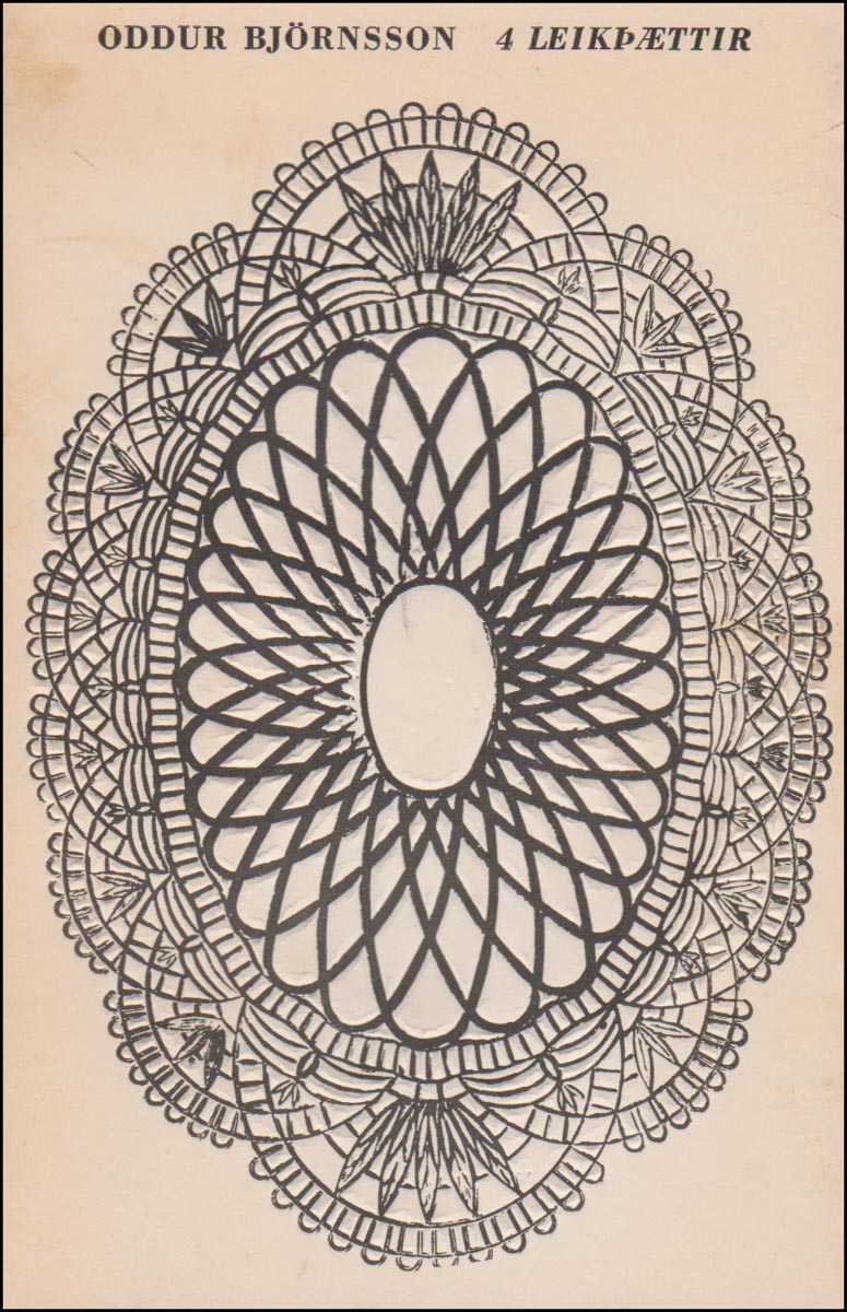 4 leikþættir eftir Odd Björnsson. Dieter Roth gerði myndirnar. Þættirnir eru: - Köngulóin. - Partí. - Við lestur framhaldssögunnar. – Amalía. - Leikrit. - Reykjavík. Ísafoldarprentsmiðja 1963. cm
