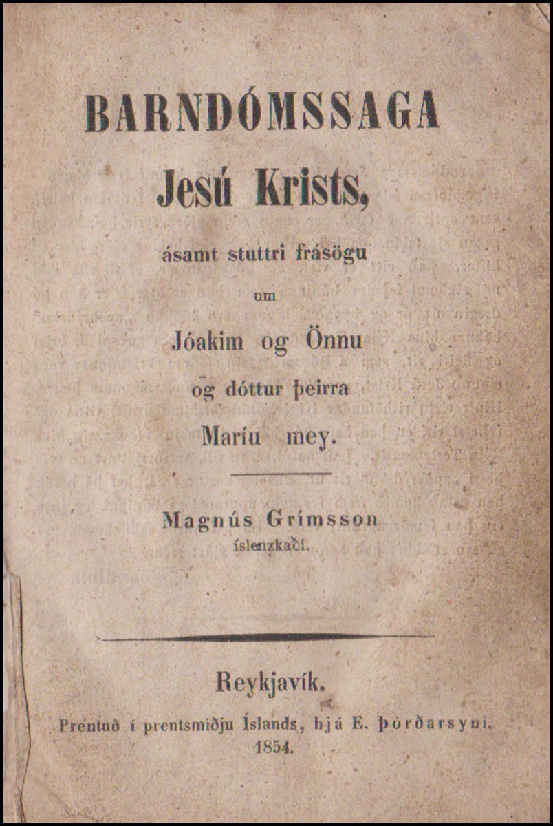 Barndómssaga Jesú Krists, ásamt stuttri frásögn um Jóakim og Önnu og dóttur þeirra Maríu mey. Magnús Grímsson íslenzkaði. Reykjavík. Prentuð í prentsmiðju Íslands, hjá E. Þórðarsyni. 1854. Meðbundin er: Minnilegur fermingardagur. Foreldragjöf á fermingard - Kristur og kirkja.