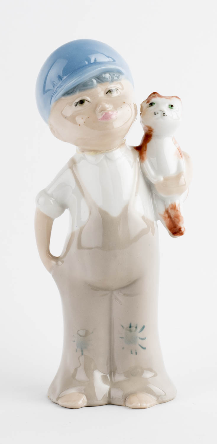 Drengur með kött - Postulín - Merkt. 19 x 9 cm