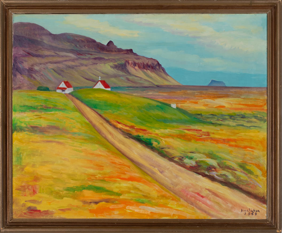 Landslag með sveitabæ - Olía - 1958. Merkt. 55 x 70 cm
