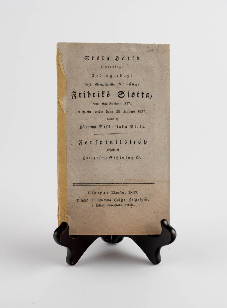 Skóla Hátíd í minníngu Fædíngardags vors allranádugasta Konúngs Fridriks Sjøtta, þann 28. Janúaríí 1837, er haldin verdur þann 29 Janúarii 1837, bodud af Kénnurum Bessastada Skóla. Forspiallslióþ útgéfin af Hallgrími Scheving. - Boðsrit Bessastaðaskóla. - Videyjar Klaustri. Prentuð af Prentara Helga Helgasyni á kostnad Bessastada Skóla, 1837. cm