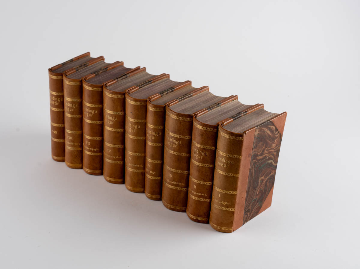 Allt góð og falleg eintök í ágætu skinnbandi. Bundið í 9 bækur. Fallegt sett.