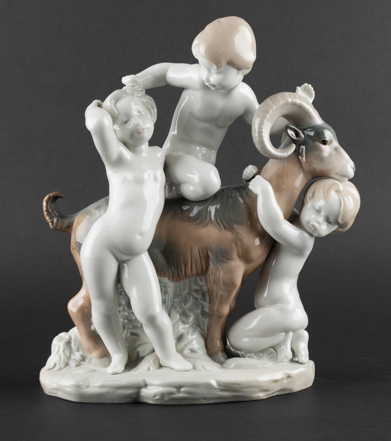 Börn í leik með geit - Postulín - 1971. #1129. Merkt. 32 x 28 cm