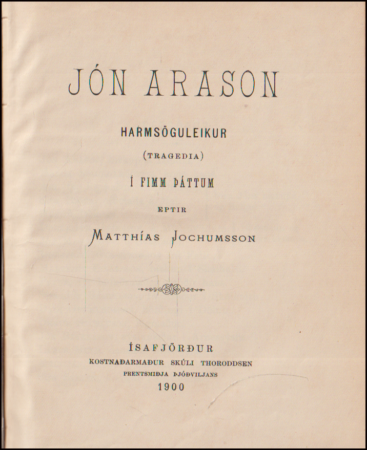 Jón Arason. Harmsöguleikur (tragedia) í fimm þáttum eftir Matthías Jochumsson. - Leikrit. - Ísafjörður. Skúli Thoroddsen, 1900. cm