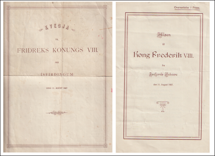 Kveðja til Friðreks konungs VIII. frá Ísfirðingum hinn 11. ágúst 1907. Kvæði eftir Guðmund Guðmundsson. Þetta er óbundið en með fylgir í ágætu bandi. - Hilsen til Kong Frederik VIII. fra Isefjords Beboere den 11. august 1907. - Ljóð. - Reykjavík. Nótna-prentsmiðja D. Östlunds, 1907. cm