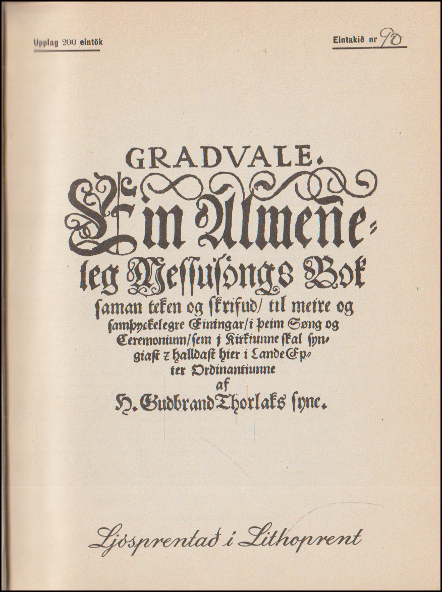 Gradvale. Ein Almeneleg Messusöngs Bók saman teken og skrifuð til meire og samþyckelegre Einingar í þeim Söng og Ceremonium sem i Kirkiunne skal syngiast og halldast hier i Lande Epter Ordinantiunne af Guðbrandur Þorláksson. Upplag 200 eintök. Þetta er ei - Sálmar. - Reykjavík. Ljósprentað í Lithoprent 1944. cm