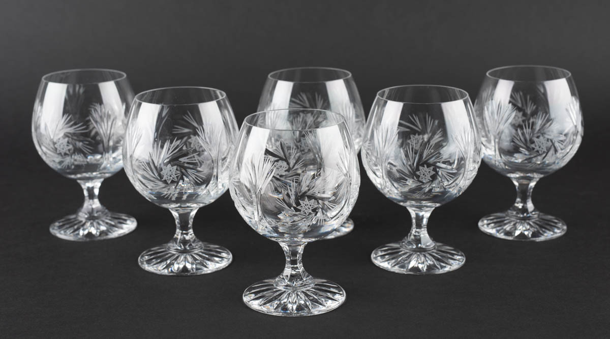 Halastjarnan - Sex Koníaksglös - Kristall - Ómerkt. 13 x 9 cm