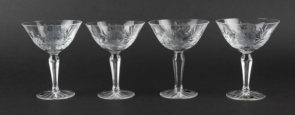Matta rósin - Fjögur kokteilglös á fæti - Kristall - Ómerkt. 13 x 11 cm