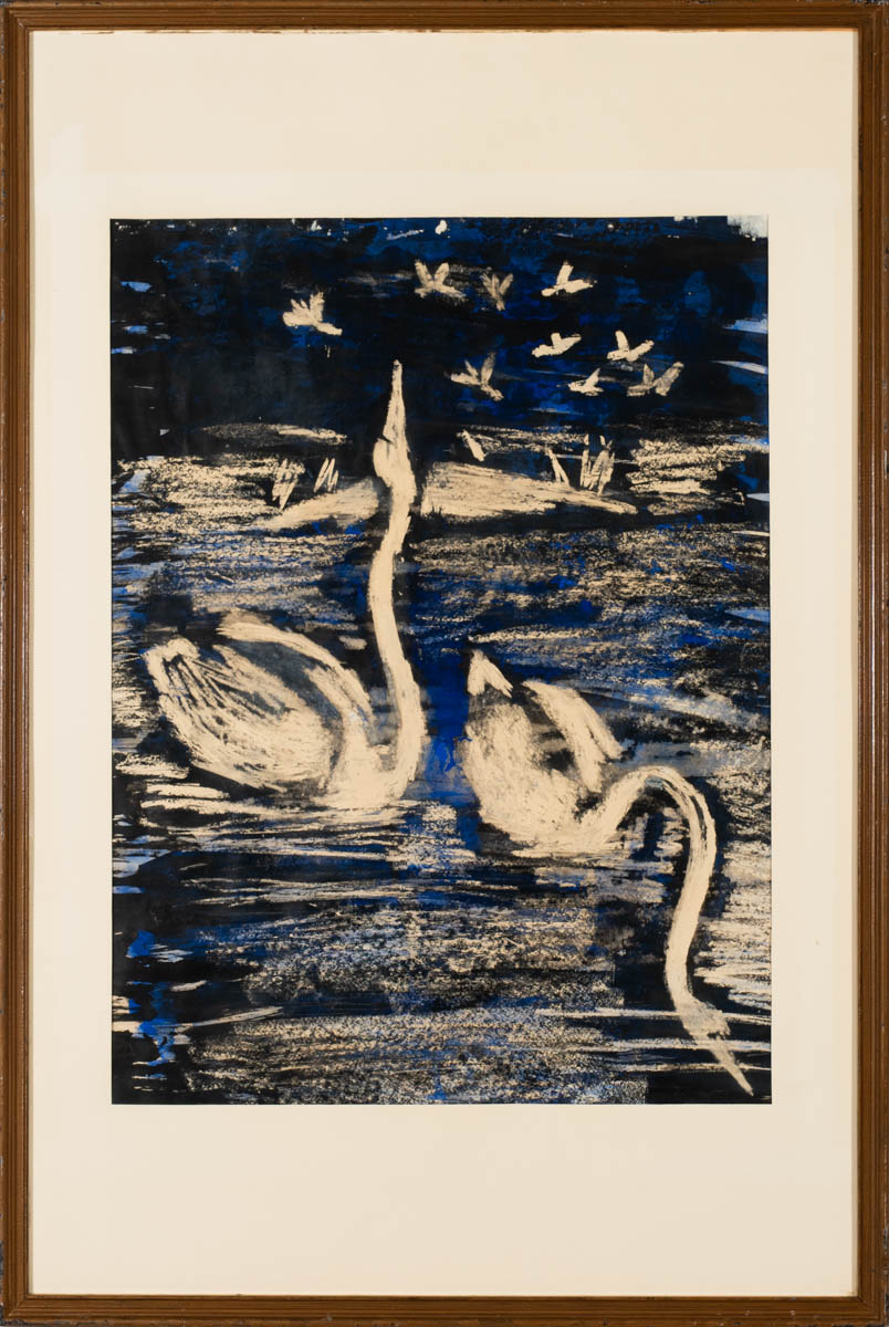 Svanir - Blönduð Tækni - Ómerkt. 67 x 50 cm