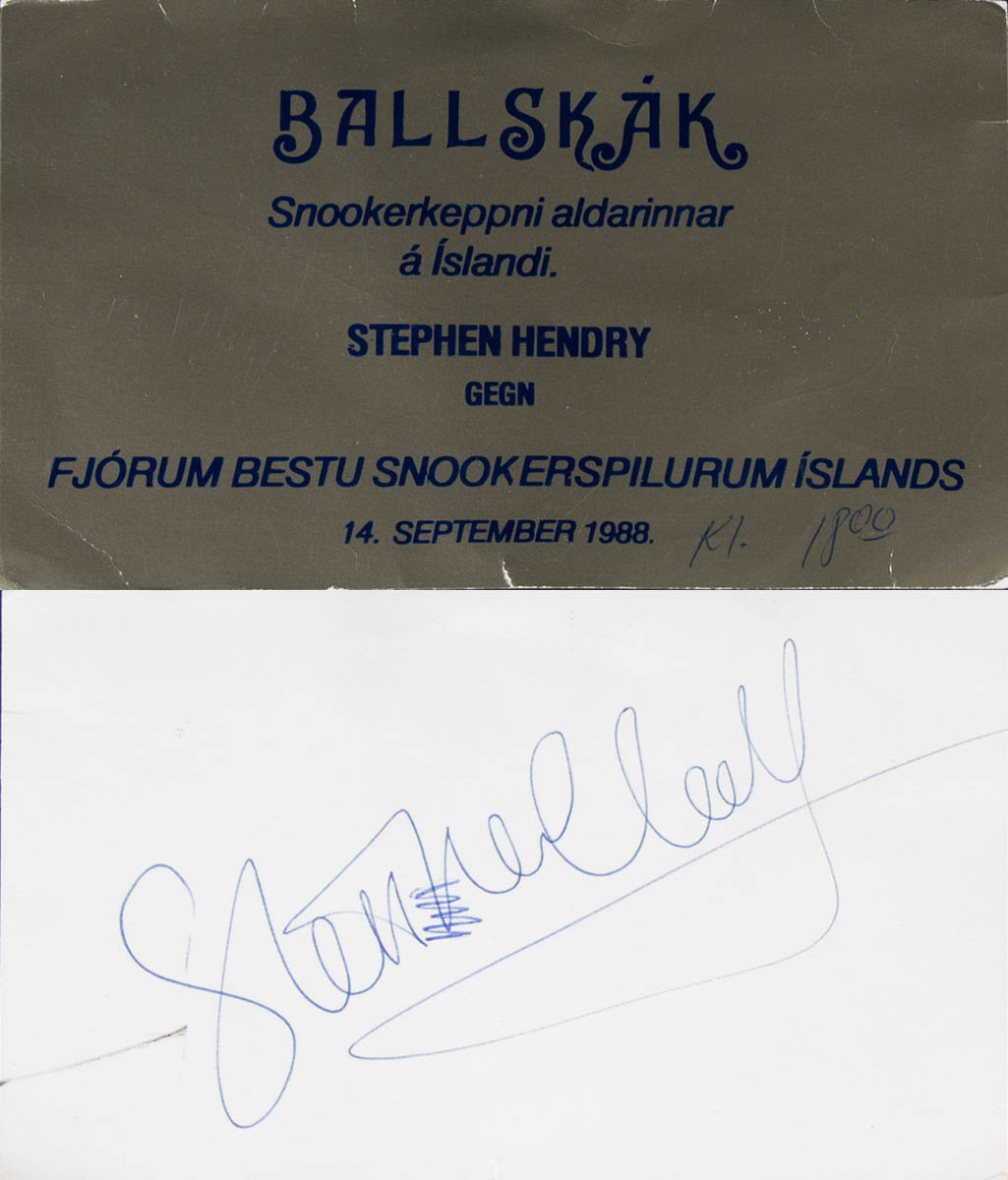 Áritaður aðgöngumiði frá 1988; Sjöfaldur heimsmeistari í snóker - 14 x 9 cm