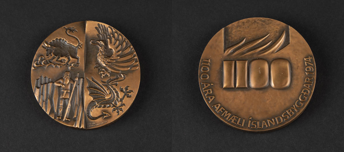 Minnispeningur þjóðhátíðarnefndar vegna 1100 ára afmæli Íslandsbyggðar - Brons - 1974. Merkt. 7 x 7 cm