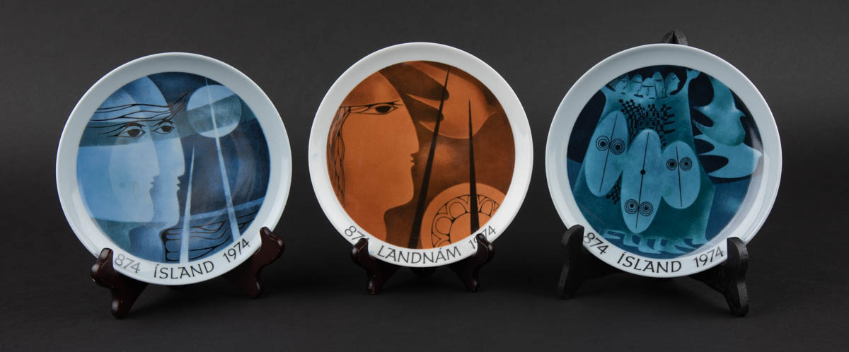 874 Landnám 1974 - þrír plattar - Postulín - Merkt. 18 cm