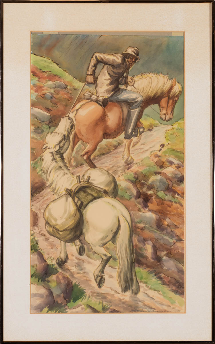 Reiðmaður með klyfjaðan hest - Vatnslitir - 1964. Merkt. 56 x 32 cm