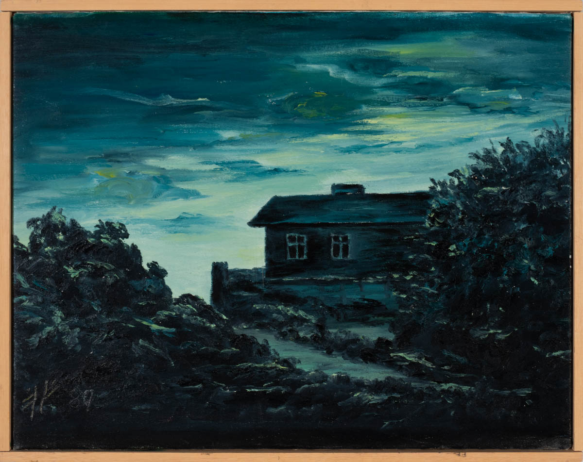 Hús í ljósaskiptunum - Olía - 1989. Merkt. 36 x 45 cm
