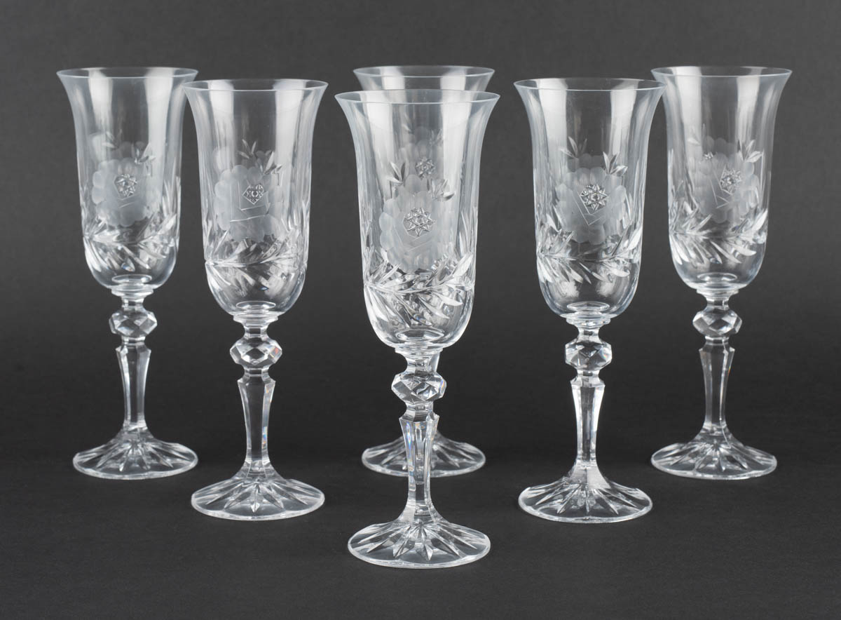 Matta rósin - Sex kampavínsglös - Kristall - Ómerkt. 21 x 0 cm