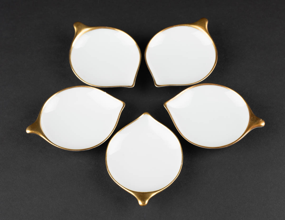 Fimm saltdiskar með gullrönd - Postulín - #200. Merkt. 10 cm