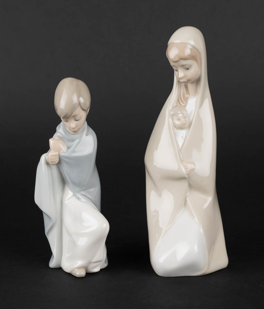 Tvær styttur - Madonna og barnið og Sankti Jósef - Postulín - Merkt. 20 x 6 cm og 16 x 5 cm